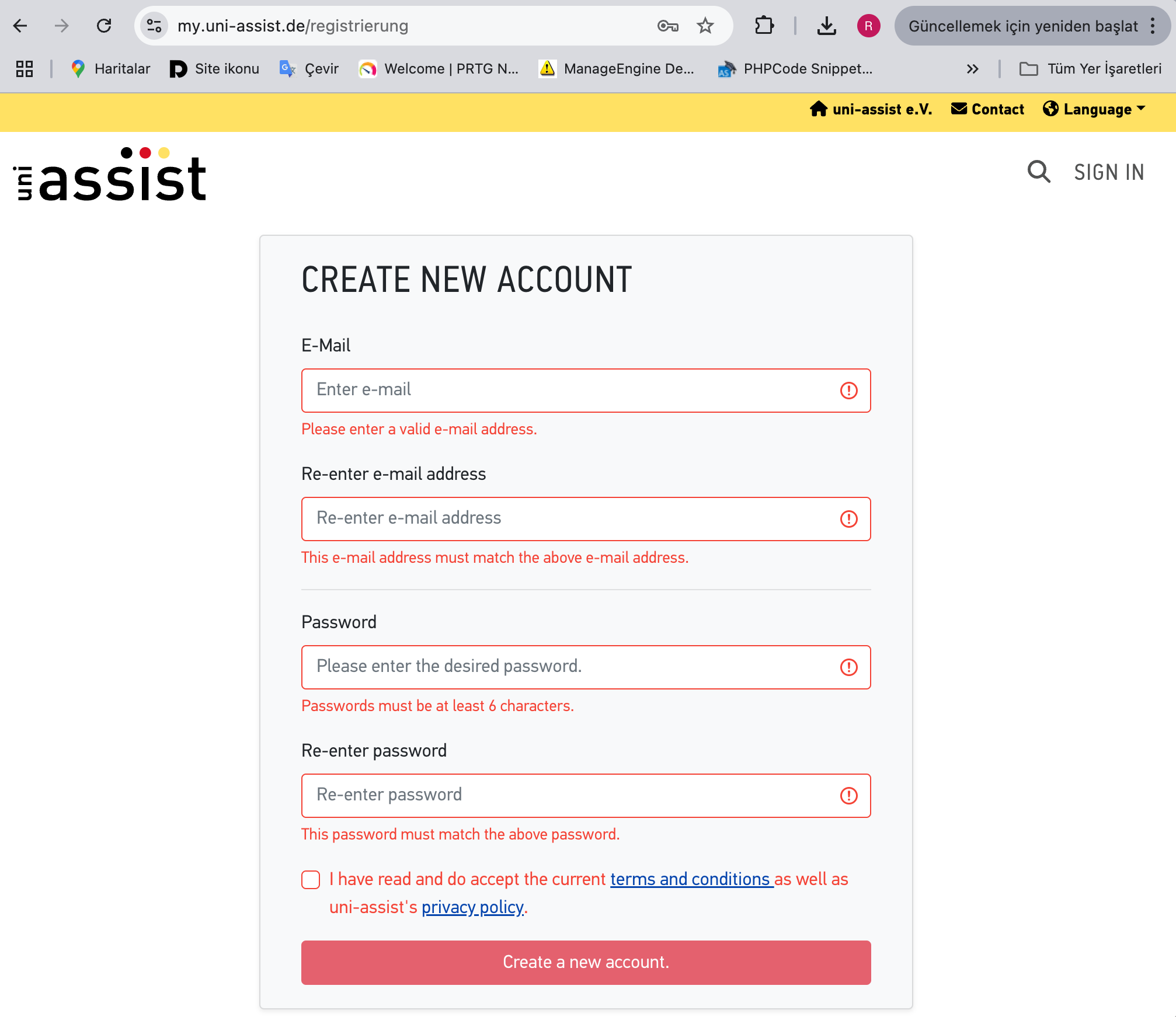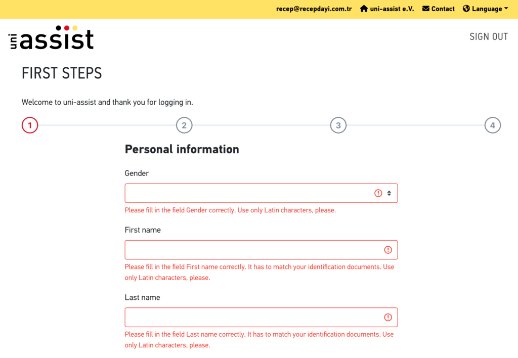 https://my.uni-assist.de/registrierung adresinden kayıt olacağız. Siteyi İngilizce ya da Almanca kullanma seçeneğiniz var. Ben burada İngilizce olarak devam ettim.