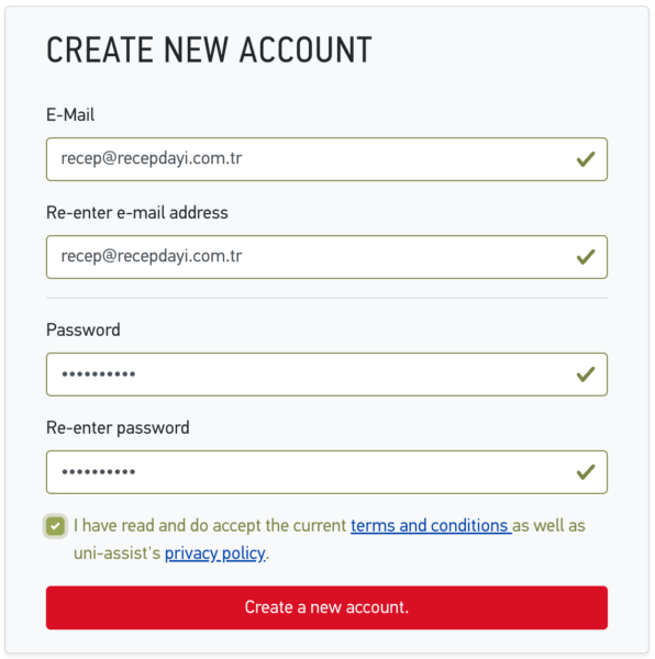 Okul Başvuruları uni-assist üzerinden başlasa bile asıl muhatabınız okuldur ve sonraki iletişimler okul ile yürütülecektir. Başvurularda kullanacağınız e-posta adresini başka amaçla kullanmayın. Gerekli ise yeni bir hesap oluşturup sadece başvurularda kullanmayı tercih etmelisiniz. Bu gelecek olan e-posta bildirilerini gözden kaçırmanızı engelleyecektir. Bu e-posta adresini düzenli olarak kontrol etmeli, gereksiz e-posta kutusunuzu da incelemelisiniz.