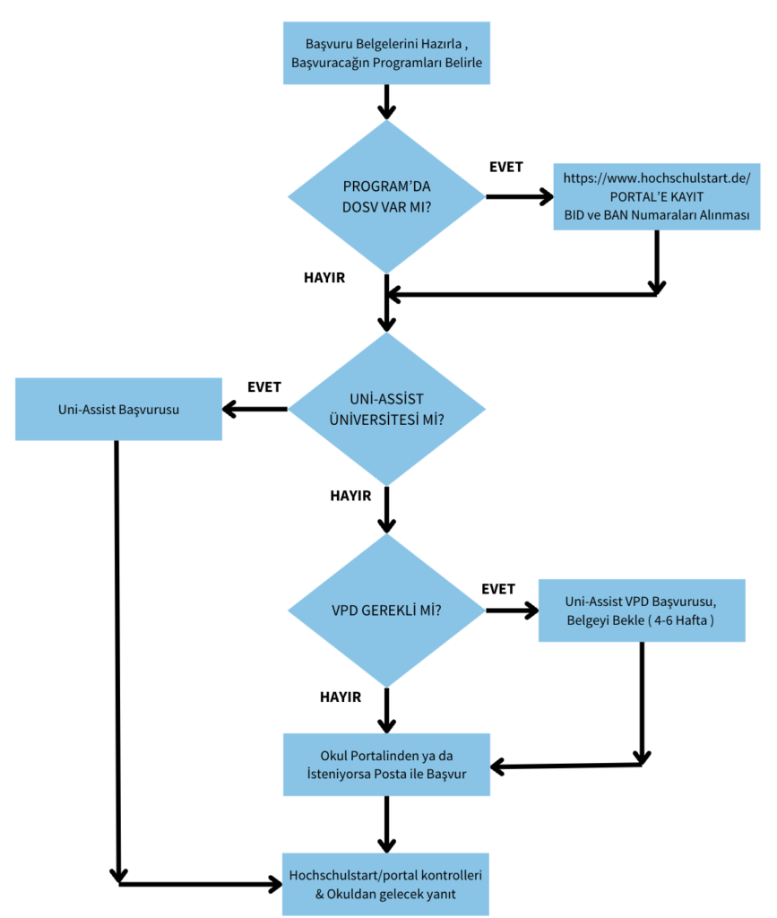Okullar portalleri üzerinden başvuru alıyorlarsa , önceden uni-assist üzerinden ya da başka bir kurumdan VPD belgesi istemiş ise belgelerinizi uni-assiste yüklemiş dahi olsanız , portale tekrar yükleme yapmalısınız. Genellikle İngilizce seçenekleri vardır. Bu nedenle Almancanız yeterli olmasa dahi işlemleri İngilizce olarak yürükmeniz mümkündür.