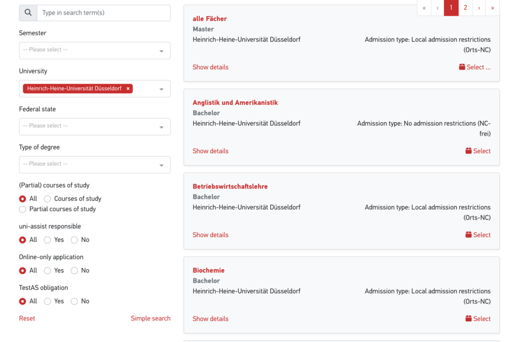 VPD Başvurularında ya da normal başvurularda tek bir seçenek olduğu gibi bazen lisans ve yüksek lisans başvurularında ayrı seçenekler olabilir. Aşağıdaki örnekte Düsseldorf Universitesinin başvuru ekranını örnek olarak görebilirsiniz. Burada Master başvuruları program farketmeksizin tek bir seçenek ile yapılırken lisans VPD başvurularında programı seçmeniz gerekiyor.