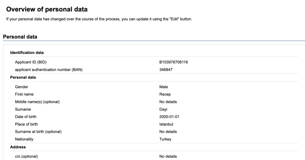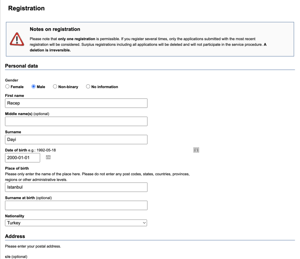 - Boş bırakabileceğiniz isim ön eki ve göbek adı gibi alanlar ( doldurmayın )