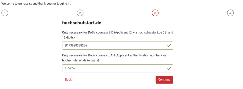 Sonraki ekranda hochschulstart portalinden aldığınız BID ve BAN numaralarınızı gireceksiniz. ( DOSV programlara başvurmayacaksanız zorunlu değil )