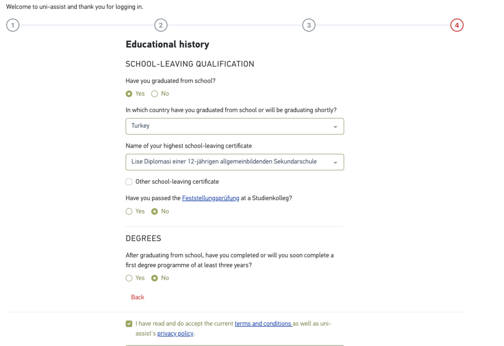 4. Adımda mezun olduğunuz okul bilgilerinizi girmelisiniz. Eğer bir uluslararası diplomanız varsa o ülkeyi seçmelisiniz. Örneğin “Matura” diploması olanlar Mezun oldukları ülke olarak Avusturya seçmelidir. Diğer ülke diplomaları da aynı şekildedir. IB diploması olanlar ülke olarak Türkiye’yi seçip , “Other school-leaving certificate” işaretlemelidir.