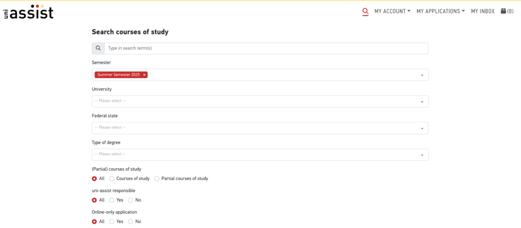 Şifrenizi tekrar girerek formu yolladığınızda uni-assist kaydınız tamamlanmış olacak. Artık okullar ve programlar arasında arama yaparak istediğiniz programı başvuru sepetinize ekleyebilirsiniz.